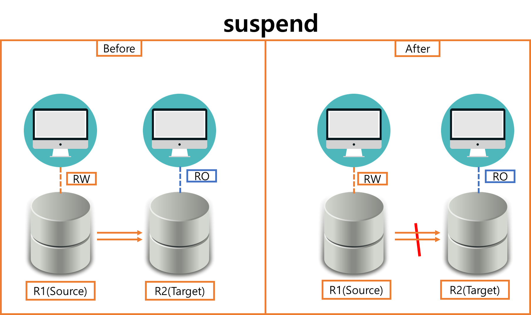 "suspend" 명령어가 실행되면 R1/R2 간의 볼륨의 상태는 변하지않고, 단지 Link만 NR로 변경됩니다.