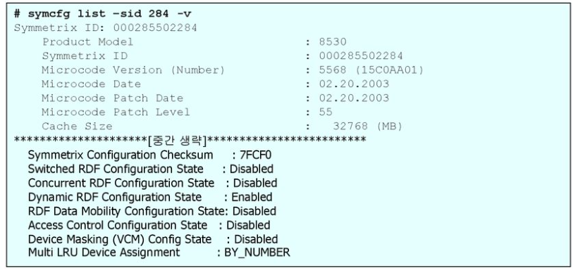 상세한 symmetrix 구성정보를 확인할 수 있습니다. 로컬 호스트에 연결된 모든 symmetrix 정보를 보거나 -sid 옵션을 통해 특정 symmetrix 정보도 확인이 가능합니다.