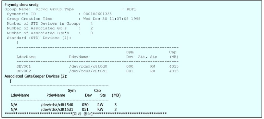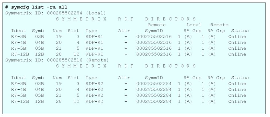 symmetrix간의 연결정보를 확인할 때 사용하며, Local 과 Remote symmetrix 간 RDF Link 디렉터에 대한 상세정보 확인이 가능합니다. (Port 번호 및 번호 수, 연결정보 등)