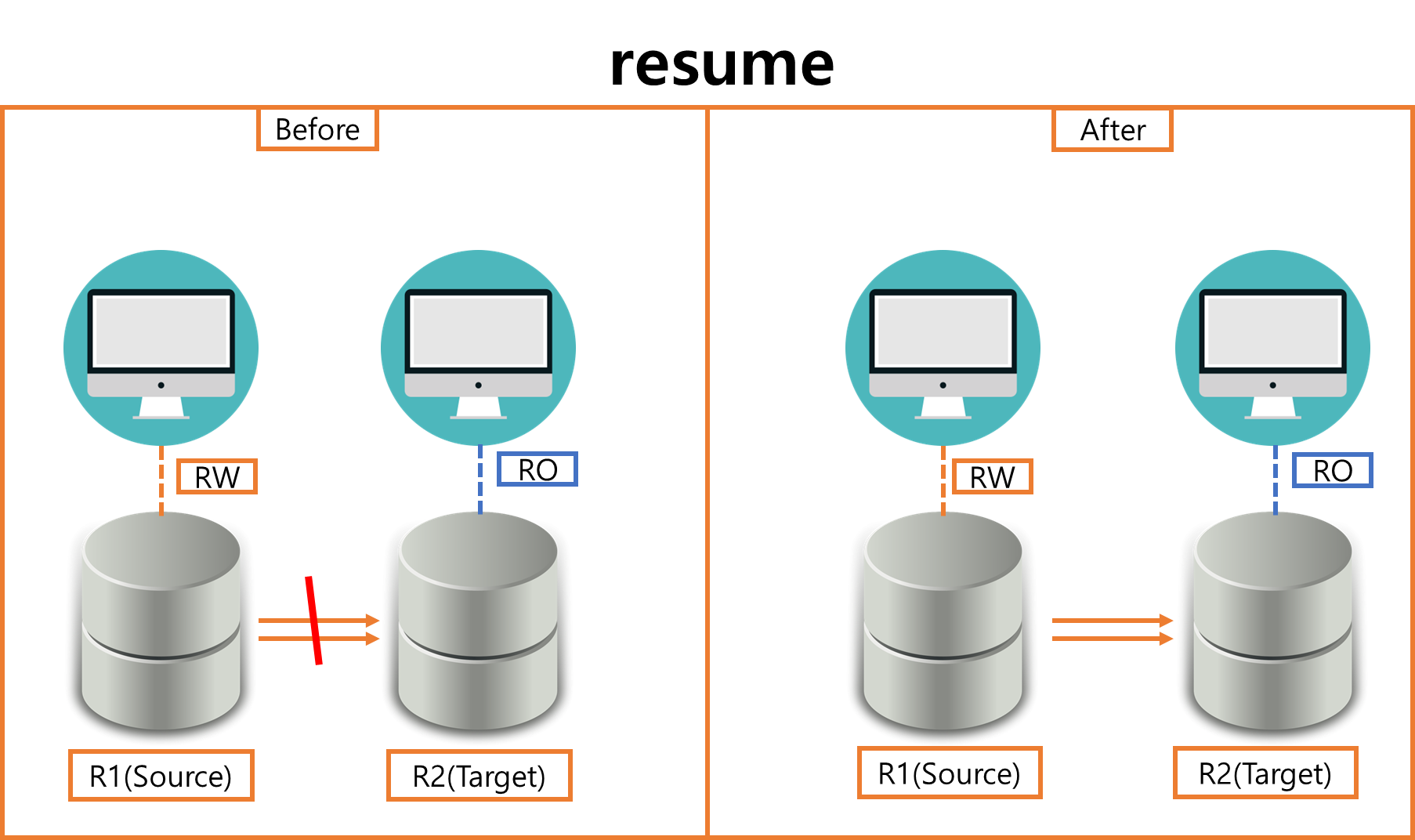 따라서 Target 에 있는 Data를 완벽하게 복구하기 위해서는 잠시 Source로 들어오는 I/O 중지시키고 restore하는 것을 권장드립니다. Restore 명령어가 수행되면 Target 은 RO(Read-Only)상태로 변경되어 Host로부터 Write가 차단되고 Link 상태는 RW(Write enabled)상태로 변경되어 Target에서 Source 로 Data가 복구가됩니다. Target에서 Source로 복구하는동시에