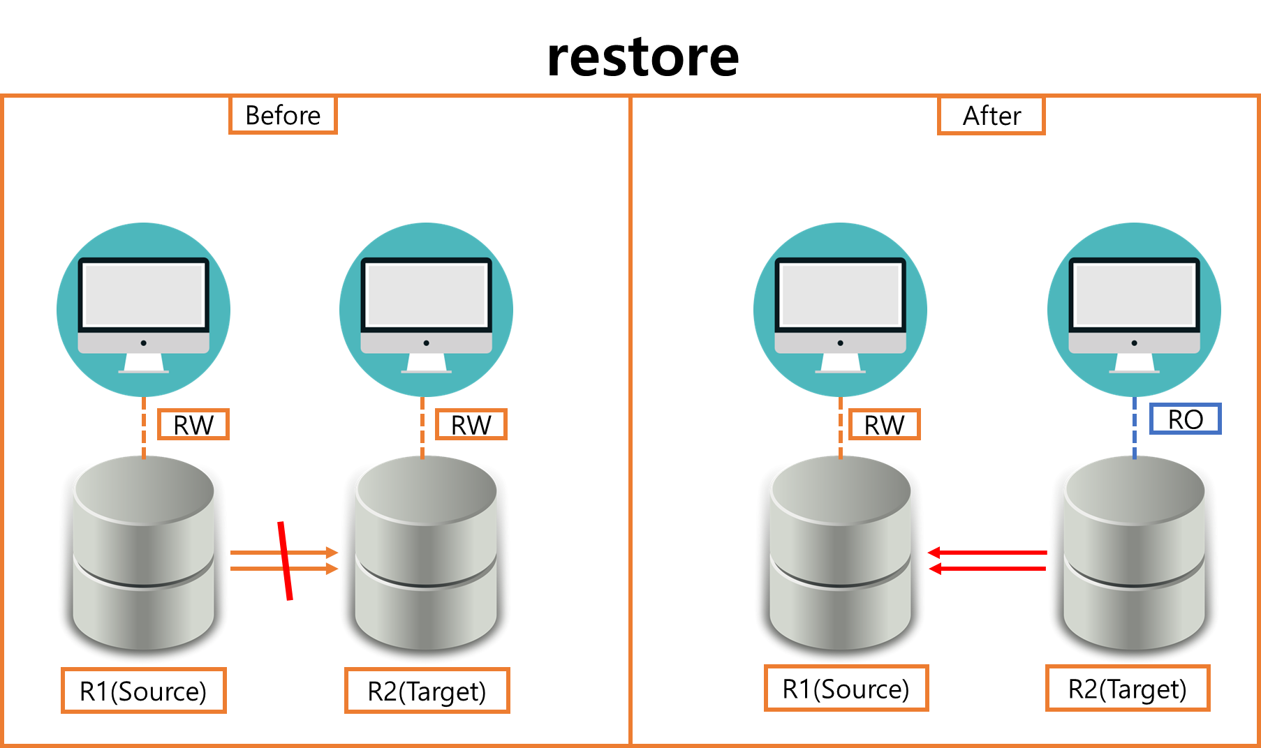 따라서 Target 에 있는 Data를 완벽하게 복구하기 위해서는 잠시 Source로 들어오는 I/O 중지시키고 restore하는 것을 권장드립니다. Restore 명령어가 수행되면 Target 은 RO(Read-Only)상태로 변경되어 Host로부터 Write가 차단되고 Link 상태는 RW(Write enabled)상태로 변경되어 Target에서 Source 로 Data가 복구가됩니다. Target에서 Source로 복구하는동시에