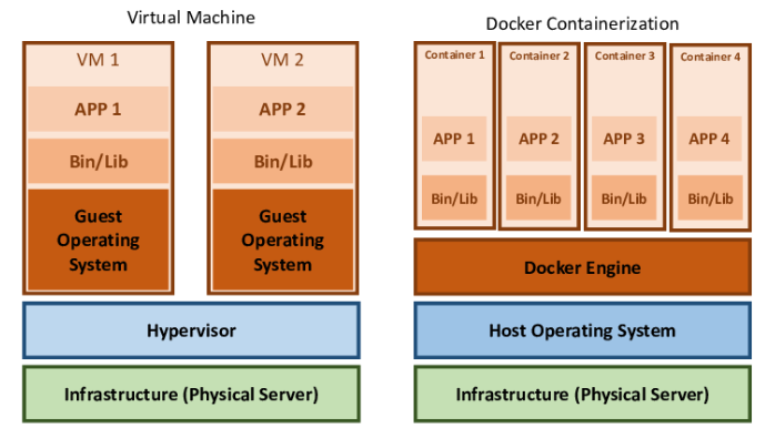 도커의 컨테이너를 이해하기 위해 가상 머신(Virtual Machine, VM)과 비교해보겠습니다.