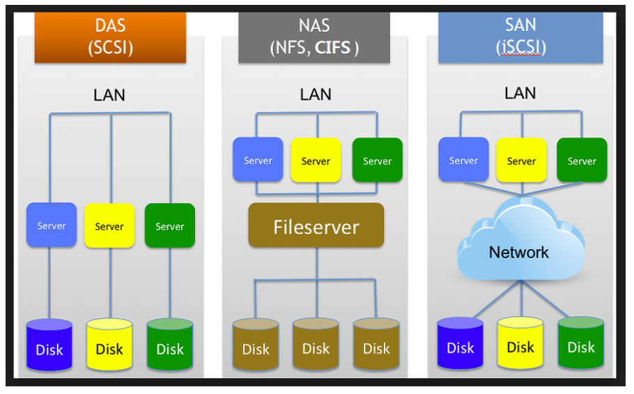 서버가 채널(SCSI 또는 Fiber Channel)을 통해 저장 장치에 직접 연결하여 사용하는 방식